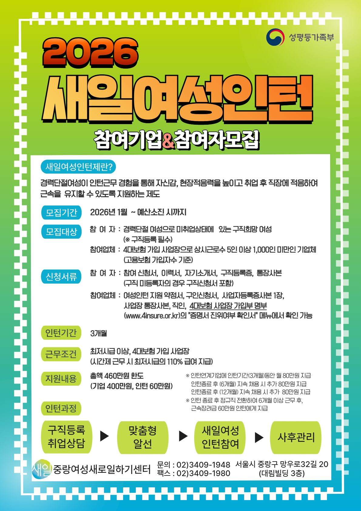 [모집] 2026년 "새일여성인턴 " 참여 기업 및 참여자 모집